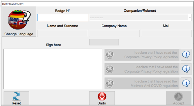 La maschera di base richiede di identificare il N° di Badge o Cartellino, una volta indicato il numero corretto i campi successivi vengono attivati e sono tutti obbligatori tranne l’indirizzo mail. Solo una volta compilati tutti i campi sarà possibile Accettare e registrare l’ingresso
