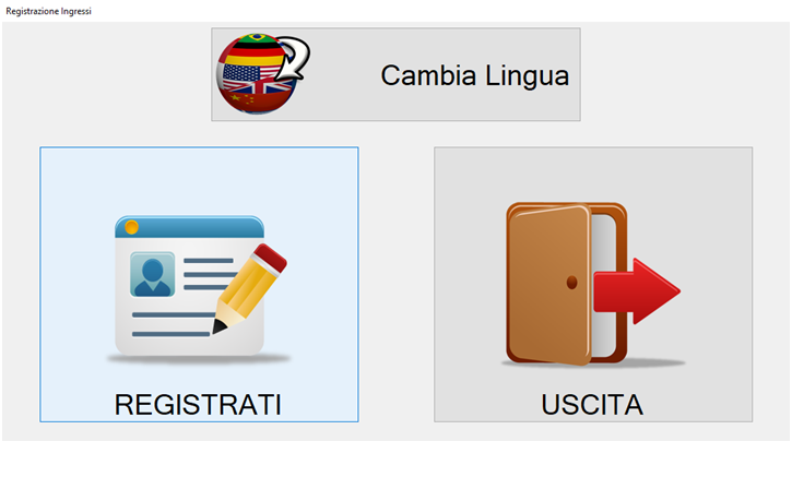 La schermata base è composta da tre bottoni, ideale per monitor touch screen anche di piccole dimensioni, e di immediato utilizzo da parte di qualsiasi utente. Vi invitiamo quindi a provare ad usarlo senza seguire il manuale, che sarà necessario solo per le funzioni di visualizzazione registro e customizzazione della lingua.